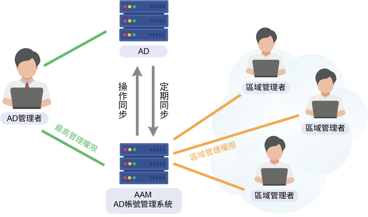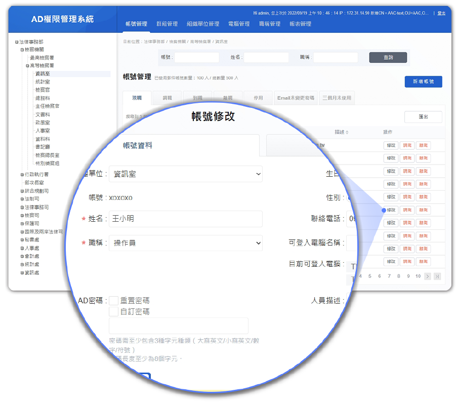 | 【隔離操作】 所屬單位資訊人員無須直接碰觸AD伺服器。 | 【風險降低】 避免過多人員持有AD管理權限,操作更安全。 |